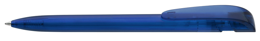 Druckkugelschreiber mit transparent glänzendem Gehäuse und breitem Bogenclipdrücker.