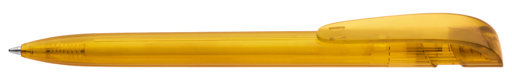 Druckkugelschreiber mit transparent glänzendem Gehäuse und breitem Bogenclipdrücker.