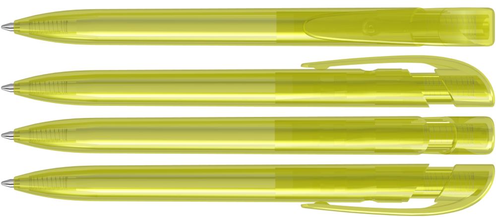 Druckkugelschreiber mit transparent glänzendem Gehäuse und breitem Bogenclipdrücker.
