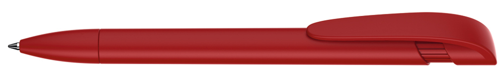 Druckkugelschreiber mit gedeckt mattem Gehäuse, breitem Bogenclipdrücker und Spitze.