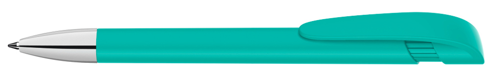 Druckkugelschreiber mit gedeckt mattem Gehäuse, breitem Bogenclipdrücker und silberner Spitze glanzverchromt.