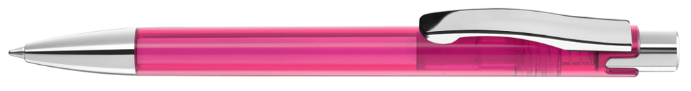 Druckkugelschreiber mit transparent glänzendem Gehäuse, schwerer Metallspitze, Metalldrücker und Metallclip glanzverchromt.