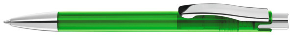 Druckkugelschreiber mit transparent glänzendem Gehäuse, schwerer Metallspitze, Metalldrücker und Metallclip glanzverchromt.