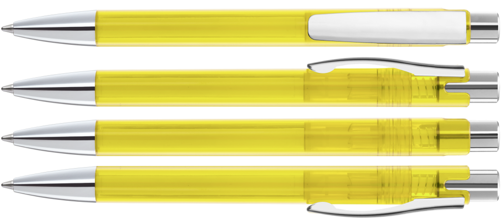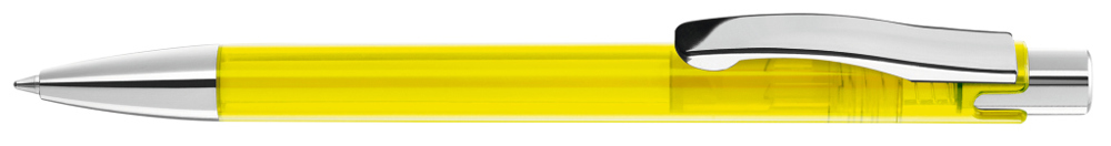 Druckkugelschreiber mit transparent glänzendem Gehäuse, schwerer Metallspitze, Metalldrücker und Metallclip glanzverchromt.