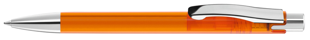 Druckkugelschreiber mit transparent glänzendem Gehäuse, schwerer Metallspitze, Metalldrücker und Metallclip glanzverchromt.