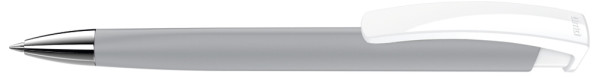 Druckkugelschreiber mit gummiertem Dreikantgehäuse, weiß gedeckt glänzendem Clip und schwerer Metallspitze glanzverchromt.
