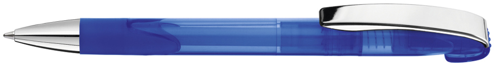 Druckkugelschreiber mit transparent glänzendem Gehäuse, Gummigriffzone, schwerer Metallspitze und Metallclip glanzverchromt.