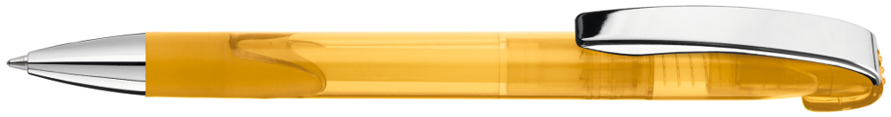 Druckkugelschreiber mit transparent glänzendem Gehäuse, Gummigriffzone, schwerer Metallspitze und Metallclip glanzverchromt.
