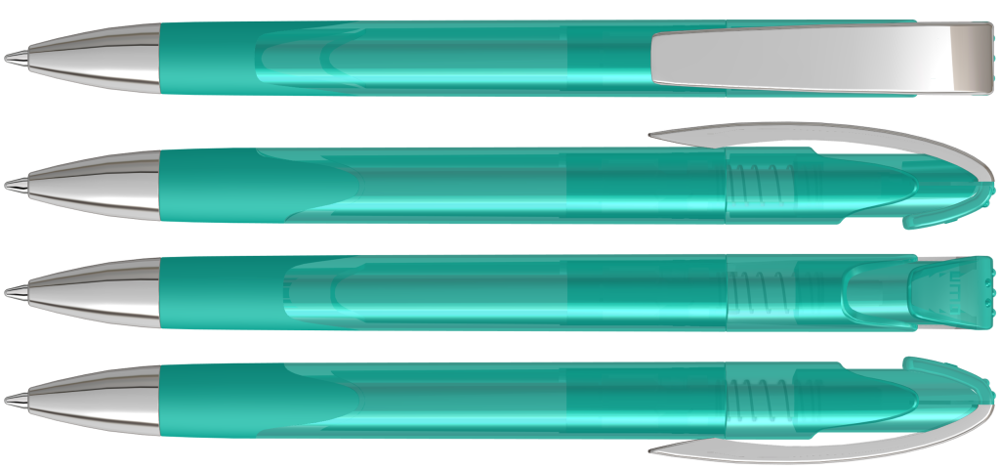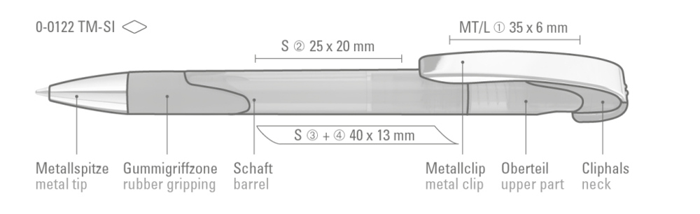 Druckkugelschreiber mit transparent glänzendem Gehäuse, Gummigriffzone, schwerer Metallspitze und Metallclip glanzverchromt.