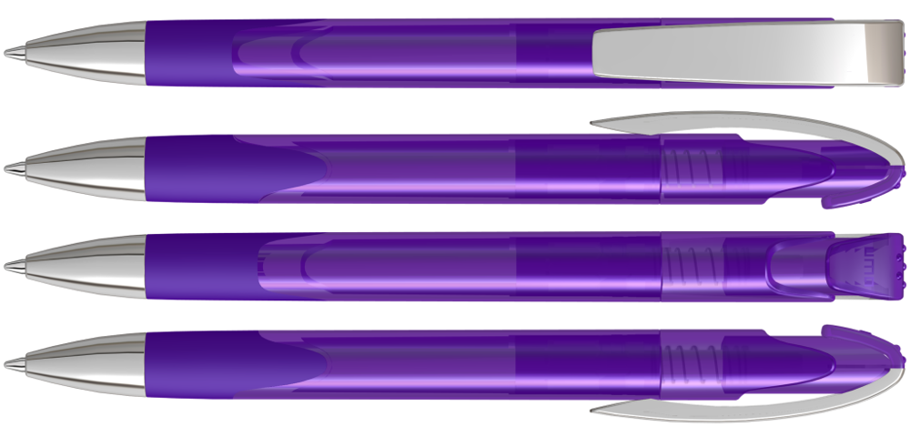 Druckkugelschreiber mit transparent glänzendem Gehäuse, Gummigriffzone, schwerer Metallspitze und Metallclip glanzverchromt.