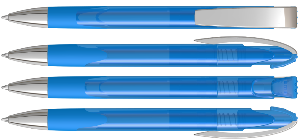 Druckkugelschreiber mit transparent glänzendem Gehäuse, Gummigriffzone, schwerer Metallspitze und Metallclip glanzverchromt.