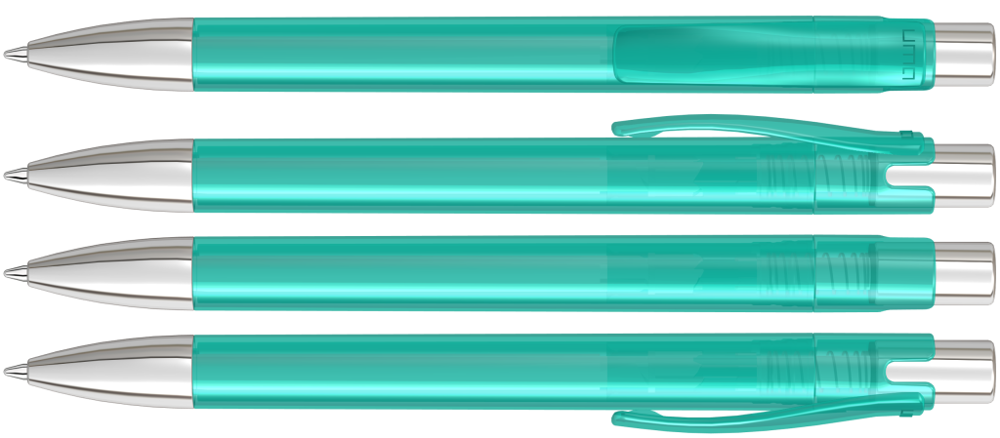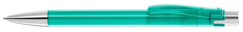 Druckkugelschreiber mit transparent glänzendem Gehäuse, Metalldrücker und schwerer Metallspitze glanzverchromt.
