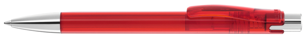 Druckkugelschreiber mit transparent glänzendem Gehäuse, Metalldrücker und schwerer Metallspitze glanzverchromt.