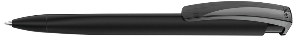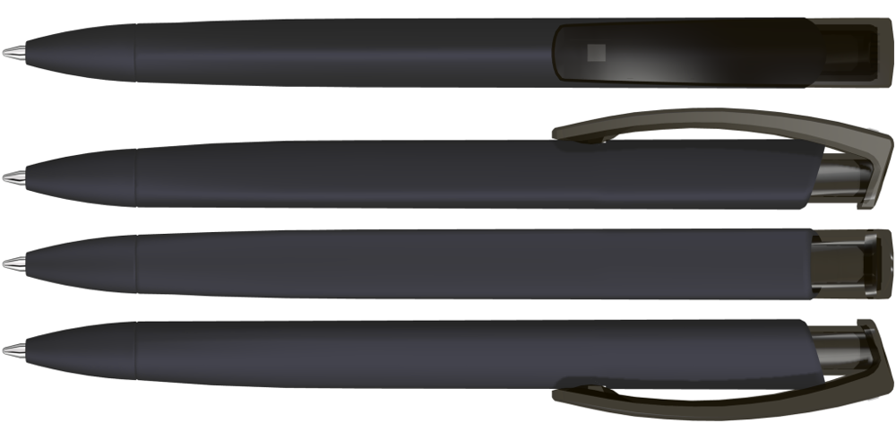 Druckkugelschreiber mit gummiertem Dreikantgehäuse und transparent glänzendem Clip.