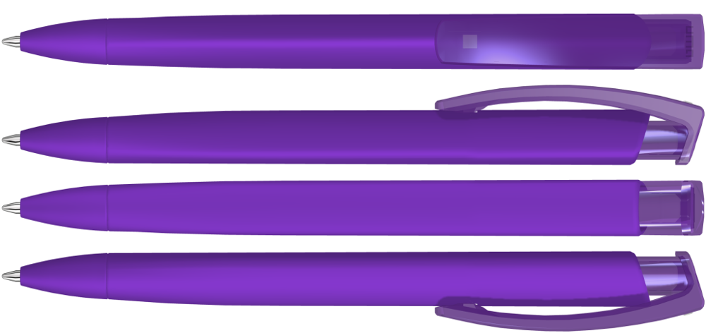 Druckkugelschreiber mit gummiertem Dreikantgehäuse und transparent glänzendem Clip.