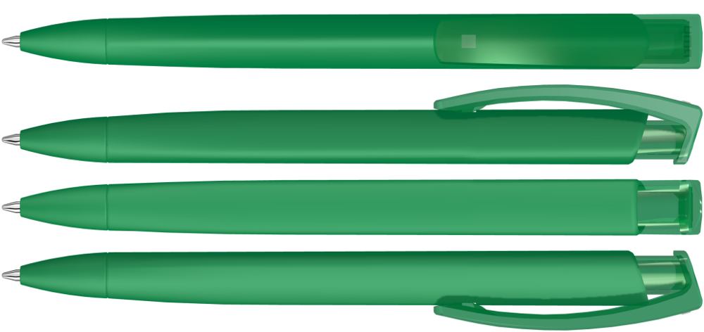 Druckkugelschreiber mit gummiertem Dreikantgehäuse und transparent glänzendem Clip. mehr