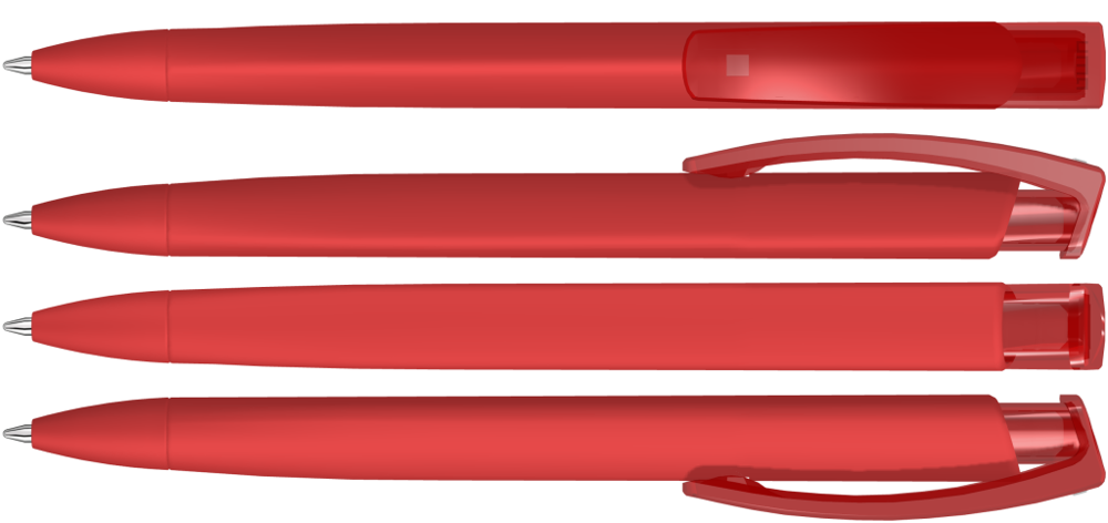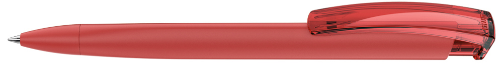 Druckkugelschreiber mit gummiertem Dreikantgehäuse und transparent glänzendem Clip.