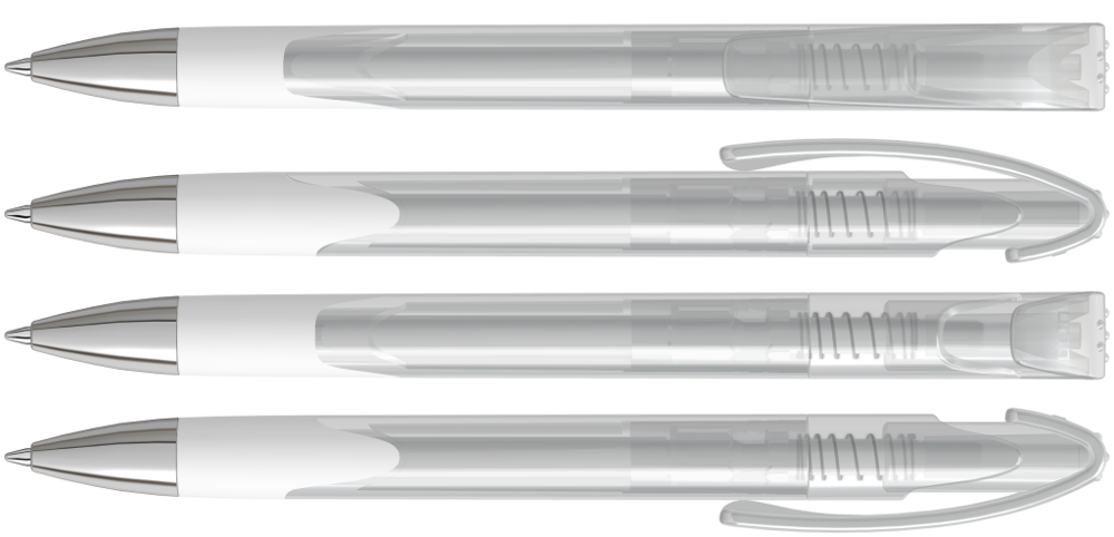 Druckkugelschreiber mit transparent glänzendem Gehäuse, Gummigriffzone und schwerer Metallspitze glanzverchromt.