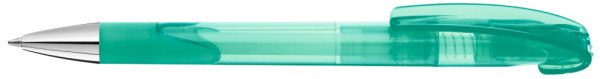 Druckkugelschreiber mit transparent glänzendem Gehäuse, Gummigriffzone und schwerer Metallspitze glanzverchromt.