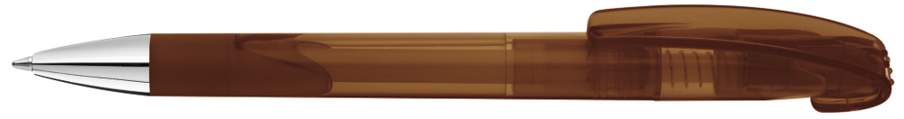 Druckkugelschreiber mit transparent glänzendem Gehäuse, Gummigriffzone und schwerer Metallspitze glanzverchromt.