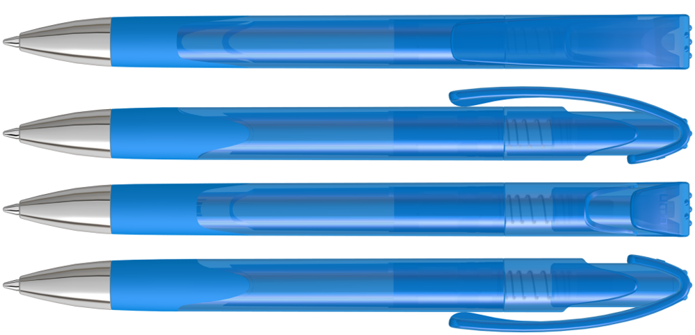 Druckkugelschreiber mit transparent glänzendem Gehäuse, Gummigriffzone und schwerer Metallspitze glanzverchromt.
