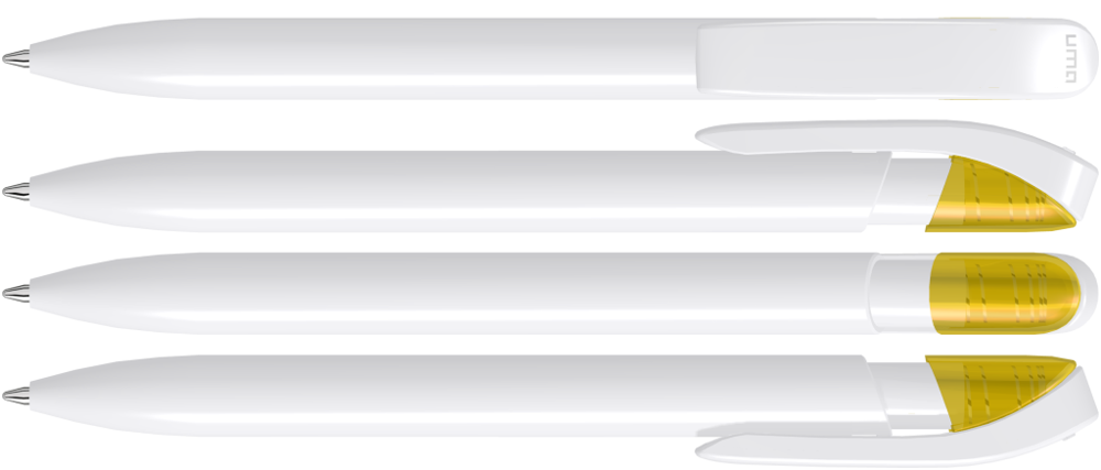 Druckkugelschreiber mit gedeckt glänzendem Gehäuse in uni weiß oder schwarz und farbig transparent glänzende Manschette.