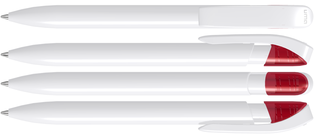 Druckkugelschreiber mit gedeckt glänzendem Gehäuse in uni weiß oder schwarz und farbig transparent glänzende Manschette.