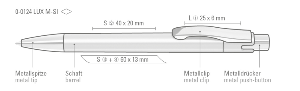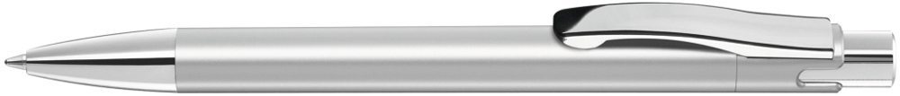 Druckkugelschreiber mit silber glänzendem Gehäuse, schwerer Metallspitze, Metalldrücker und Metallclip glanzverchromt.