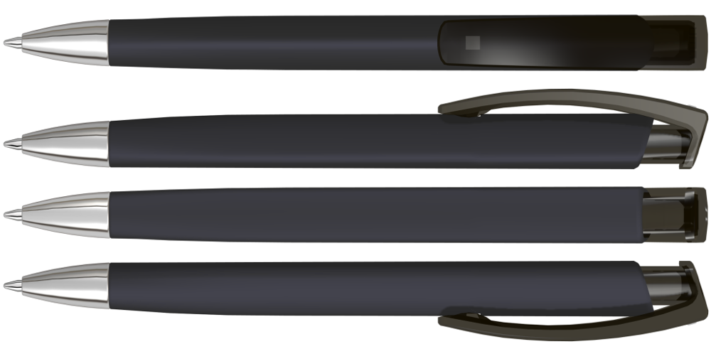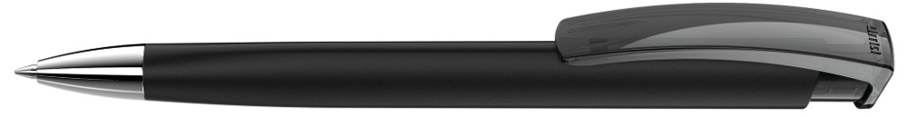 Druckkugelschreiber mit gummiertem Dreikantgehäuse, transparent glänzendem Clip und schwerer Metallspitze glanzverchromt.
