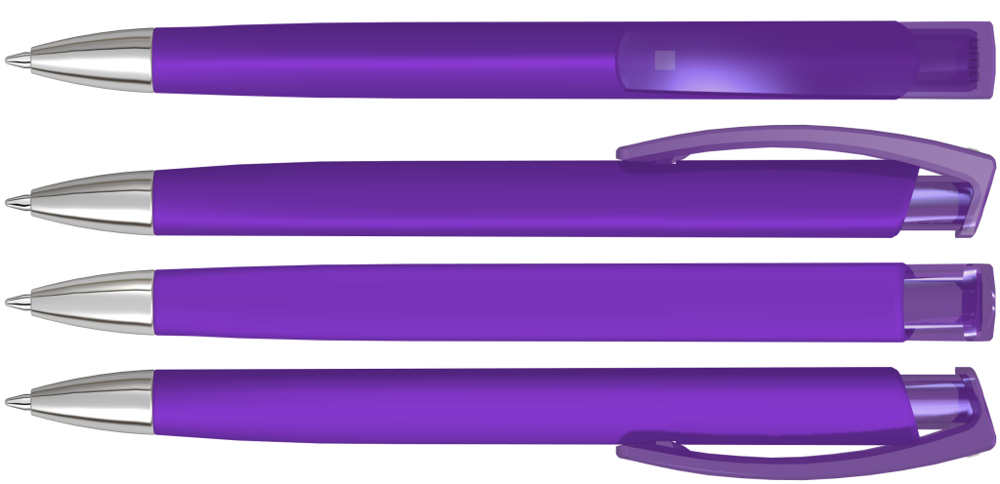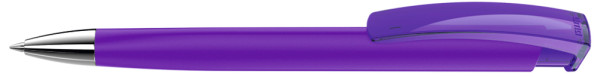 Druckkugelschreiber mit gummiertem Dreikantgehäuse, transparent glänzendem Clip und schwerer Metallspitze glanzverchromt.