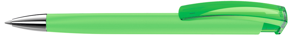 Druckkugelschreiber mit gummiertem Dreikantgehäuse, transparent glänzendem Clip und schwerer Metallspitze glanzverchromt.