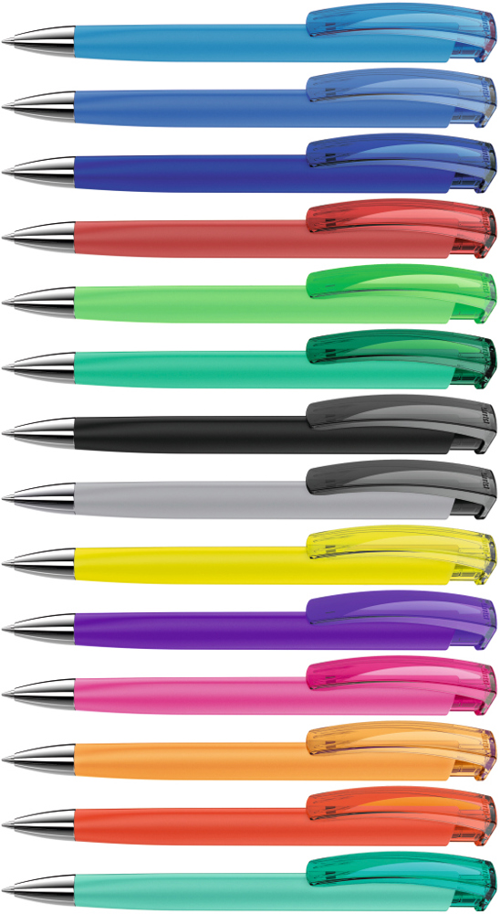 Druckkugelschreiber mit gummiertem Dreikantgehäuse, transparent glänzendem Clip und schwerer Metallspitze glanzverchromt.