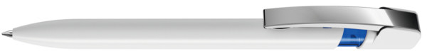 Druckkugelschreiber mit gedeckt glänzendem Gehäuse in uni weiß oder schwarz und farbig transparent glänzendem Cliphals, flexiblem Metallclip glanzverchromt.
