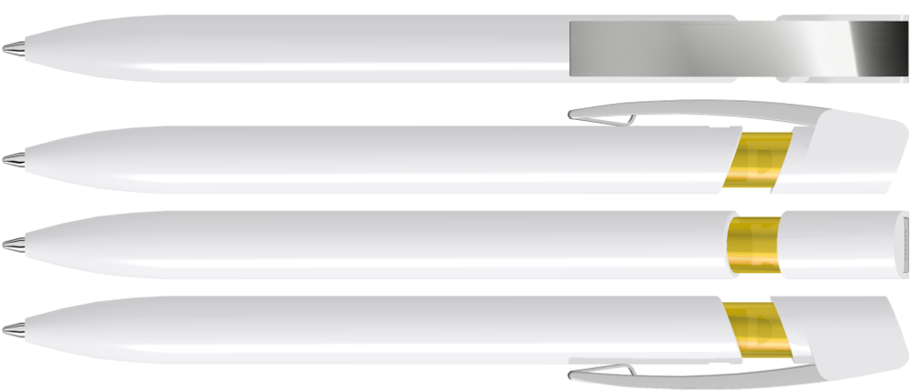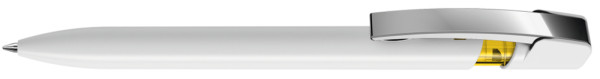 Druckkugelschreiber mit gedeckt glänzendem Gehäuse in uni weiß oder schwarz und farbig transparent glänzendem Cliphals, flexiblem Metallclip glanzverchromt.