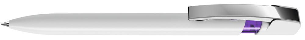 Druckkugelschreiber mit gedeckt glänzendem Gehäuse in uni weiß oder schwarz und farbig transparent glänzendem Cliphals, flexiblem Metallclip glanzverchromt.