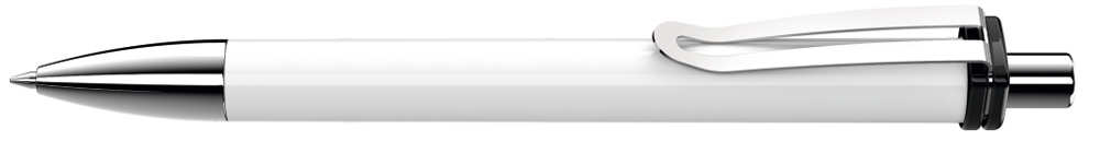 Druckkugelschreiber mit gedeckt glänzendem Schaft und Clipaufhängung. Breiter Metallbiegeclip, Metallspitze und Metalldrücker glanzverchromt.