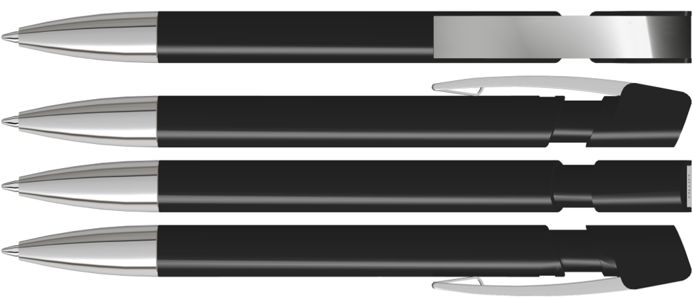 Druckkugelschreiber mit gedeckt glänzendem Gehäuse in uni weiß oder schwarz, flexiblem Metallclip und schwerer Metallspitze glanzverchromt.