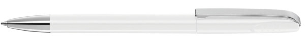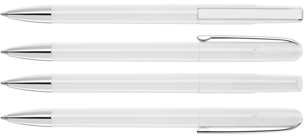 Drehkugelschreiber mit glänzend gedecktem Gehäuse, schwerer Metallspitze und Metallclip. Griffnoppen in der Kappe unterstützen den komfortablen Drehmechanismus.