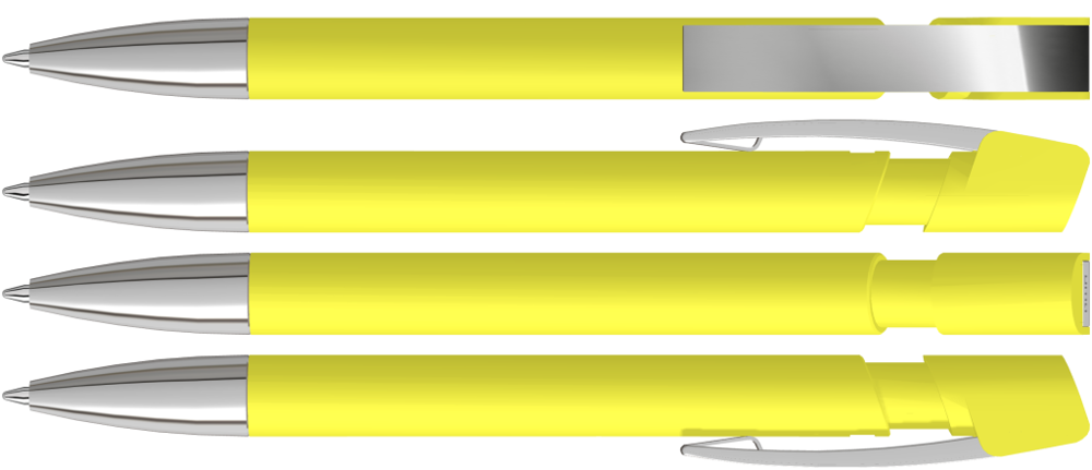 Druckkugelschreiber mit Softtouch-Gehäuse, flexiblem Metallclip und schwerer Metallspitze glanzverchromt.