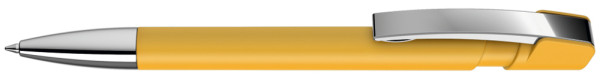 Druckkugelschreiber mit Softtouch-Gehäuse, flexiblem Metallclip und schwerer Metallspitze glanzverchromt.