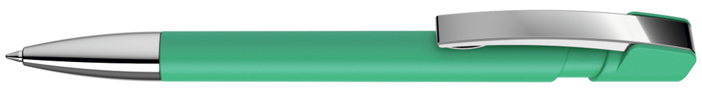 Druckkugelschreiber mit Softtouch-Gehäuse, flexiblem Metallclip und schwerer Metallspitze glanzverchromt.