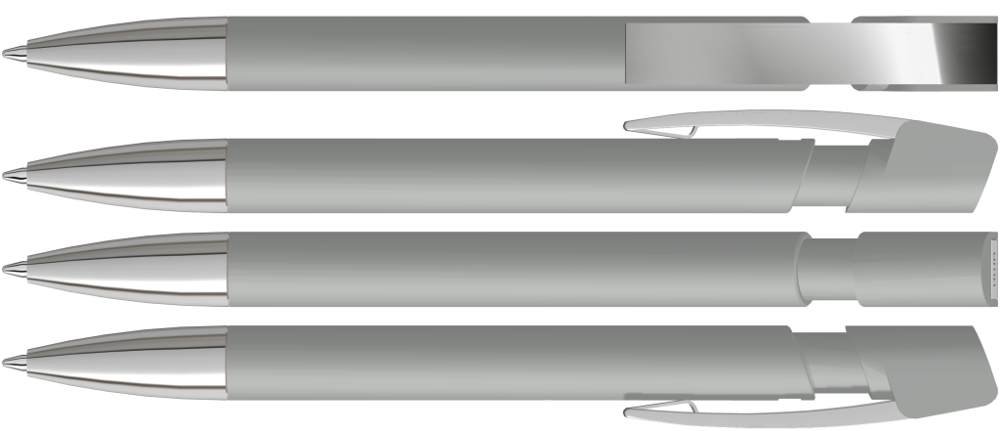 Druckkugelschreiber mit Softtouch-Gehäuse, flexiblem Metallclip und schwerer Metallspitze glanzverchromt.