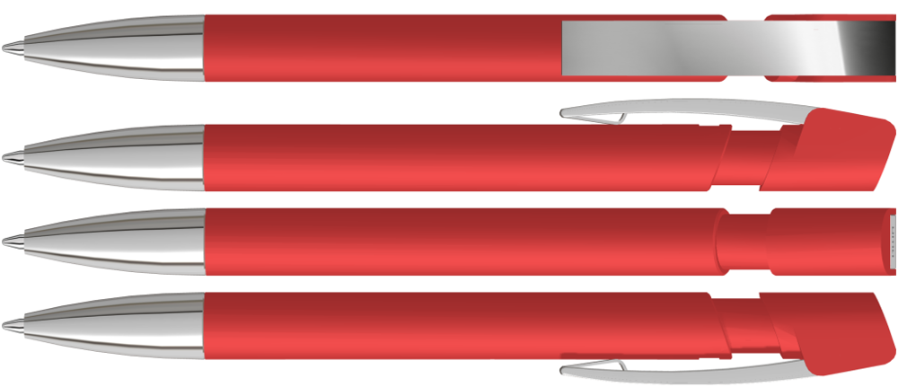 Druckkugelschreiber mit Softtouch-Gehäuse, flexiblem Metallclip und schwerer Metallspitze glanzverchromt.