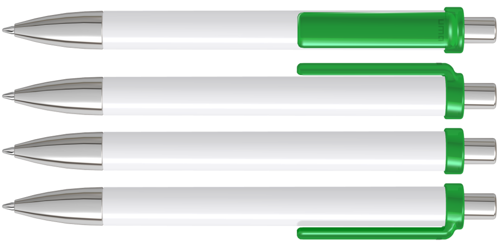 Druckkugelschreiber mit gedeckt glänzendem Schaft, transparent glänzendem Clip, Metallspitze und Metalldrücker glanzverchromt.
