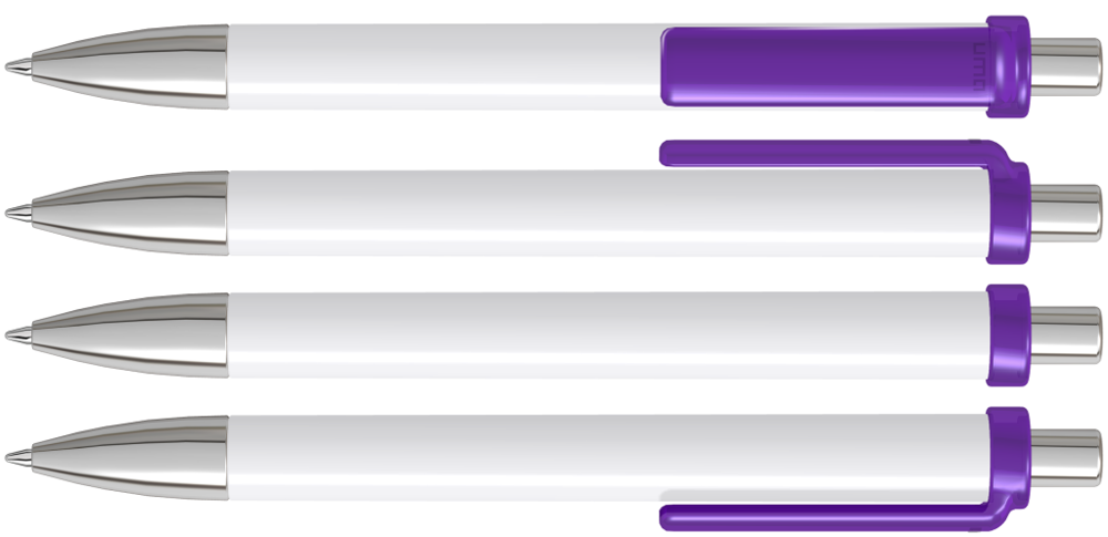 Druckkugelschreiber mit gedeckt glänzendem Schaft, transparent glänzendem Clip, Metallspitze und Metalldrücker glanzverchromt.