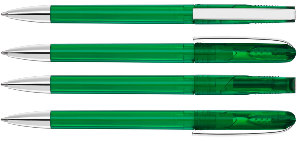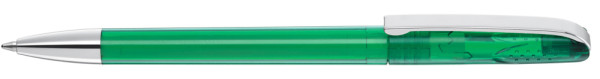 Drehkugelschreiber mit glänzend transparentem Gehäuse, schwerer Metallspitze und Metallclip. Griffnoppen in der Kappe unterstützen den komfortablen Drehmachanismus.