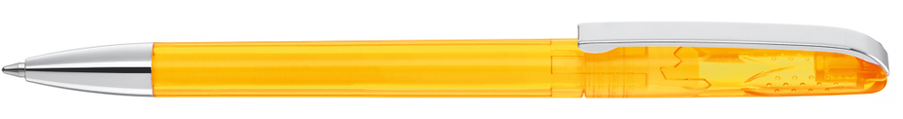 Drehkugelschreiber mit glänzend transparentem Gehäuse, schwerer Metallspitze und Metallclip. Griffnoppen in der Kappe unterstützen den komfortablen Drehmachanismus.