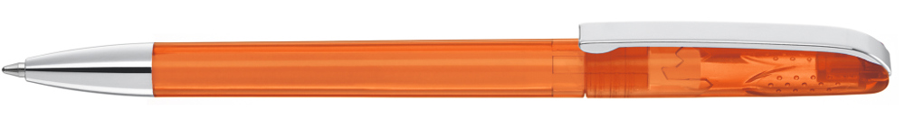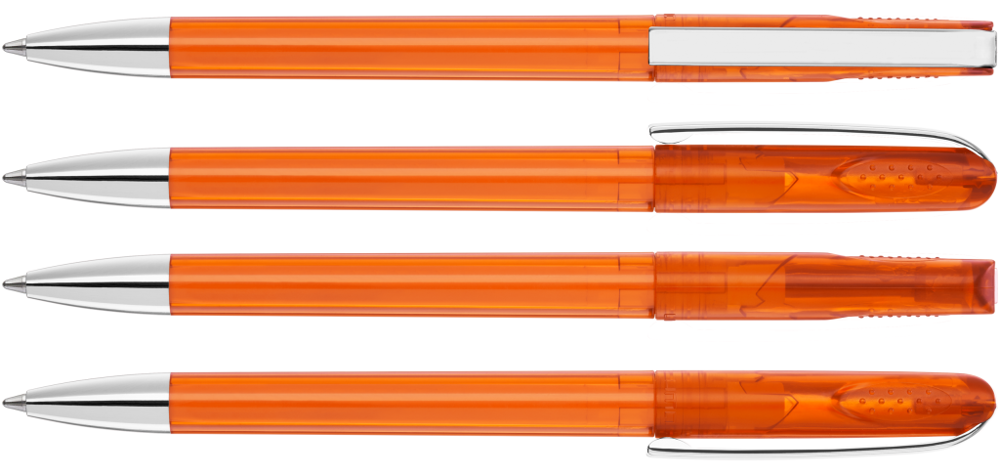Drehkugelschreiber mit glänzend transparentem Gehäuse, schwerer Metallspitze und Metallclip. Griffnoppen in der Kappe unterstützen den komfortablen Drehmachanismus.