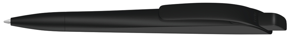 Druckkugelschreiber mit geometrisch wechselnder Schaftform. Gehäuse gedeckt matt schwarz oder weiß mit Bogenclip und farbigem Drücker.