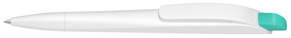 Druckkugelschreiber mit geometrisch wechselnder Schaftform. Gehäuse gedeckt matt schwarz oder weiß mit Bogenclip und farbigem Drücker.